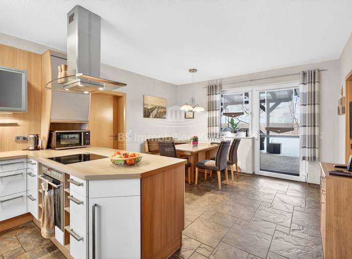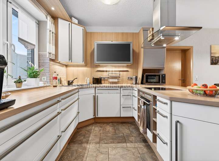 Direkt vom Haupthaus aus gelangen Sie in die separate Einliegerwohnung, die zusätzlich über einen eigenen Eingang verfügt. Diese ist funktional und komfortabel gestaltet und umfasst Wohnzimmer, Küche, Schlafzimmer, Badezimmer sowie einen eigenen Hauswirtschaftsraum. Auch die Einliegerwohnung verfügt über eine eigene Terrasse, was sie ideal für Gäste oder Mehrgenerationenwohnen macht.