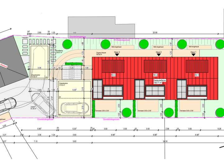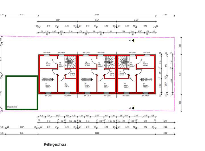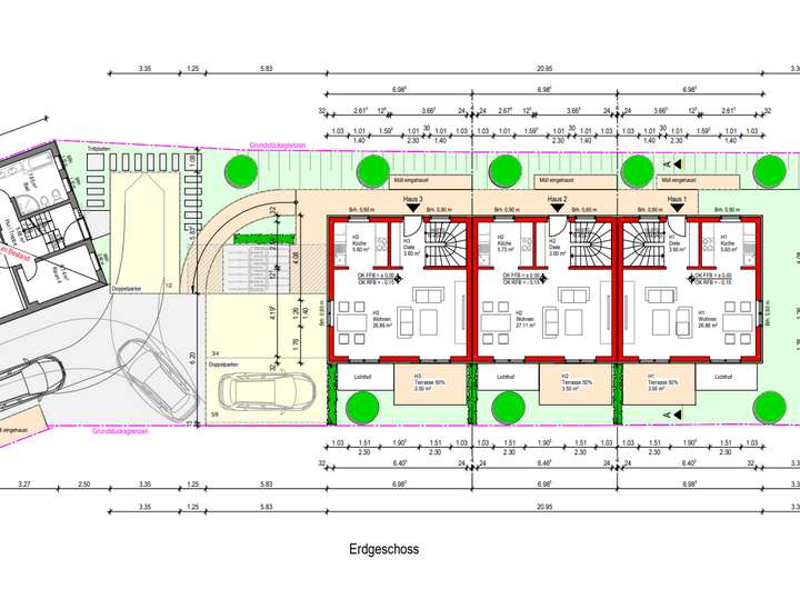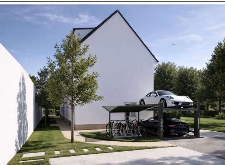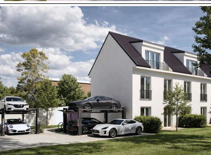 Gartenterrasse. Massive Bauweise, dreifachverglaste Fenster mit elektrischen Rollläden, moderne Haustechnik mit Wärmepumpe und Fußbodenheizung, hochwertige Sanitärmarken von Geberit und Hansa sowie frei wählbare Bodenbeläge sorgen für hohen Wohnkomfort. Im Dachgeschoss befindet sich neben einem der modernen Badezimmern ein exklusiver Ankleideraum. Zum Reihenhaus gehört ebenfalls ein Duplex-Stellplatz, bestehend aus zwei Pkw Stellplätzen