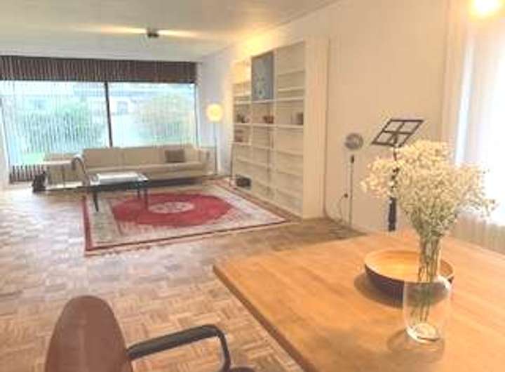 Modern house with a beautiful terrace and garden. Living- and dining-room and a room with an open-fire-place. View in the the beautiful garden. Kitchen, ful equipped open to the ding-place. 2 bathrooms. 4 bedrooms. separate rooms in the basement, partly with daylight.