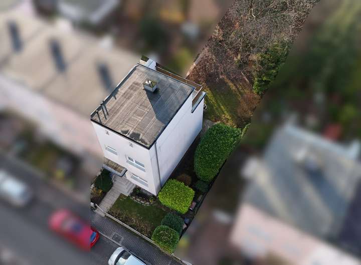 Über eine Holztreppe erreichen Sie das erste Obergeschoss mit zwei gut geschnittenen Zimmern und einem Tageslichtbad mit Dusche. Das Dachgeschoss bietet ein weiteres Zimmer, das flexibel genutzt werden kann – ideal als Arbeitszimmer, Gästezimmer oder persönlicher Rückzugsort. Ein besonderes Highlight ist die circa 18 m² große Dachterrasse, die nach Südwesten ausgerichtet ist und einen gemütlichen Platz im Freien bietet. Vorbehaltlich einer baurechtlichen Genehmigung kommt auch die Errichtung eines Wintergartens in Betracht.