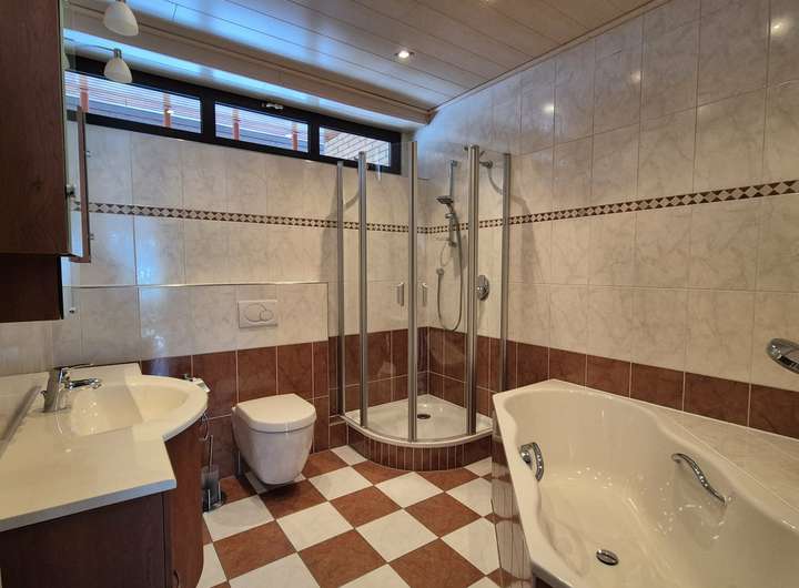 Auch das Badezimmer besticht mit einem besonderen Charme und einer tollen Ausstattung. Zu finden ist hier ein Waschbecken, ein WC, eine Dusche und einer großen Eckbadewanne in der man den Alltagsstress hinter sich lassen kann.