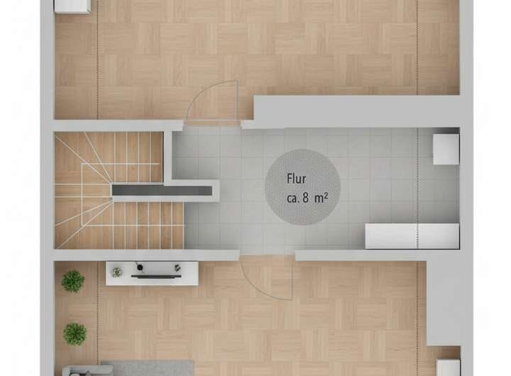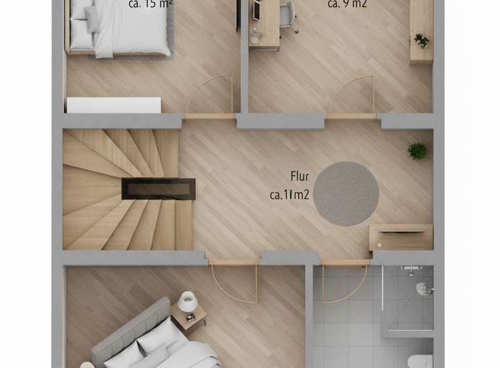 Im Obergeschoss erwarten Sie drei großzügige Zimmer, die sich flexibel als Schlaf-, Kinder- oder Arbeitsräume nutzen lassen.