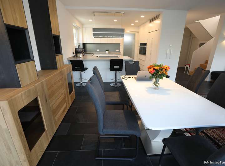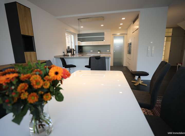 Die offen gestaltete Luxusküche ist in diesen Bereich integriert und lässt das Herz des Hobby-wie auch Profikochs höherschlagen.