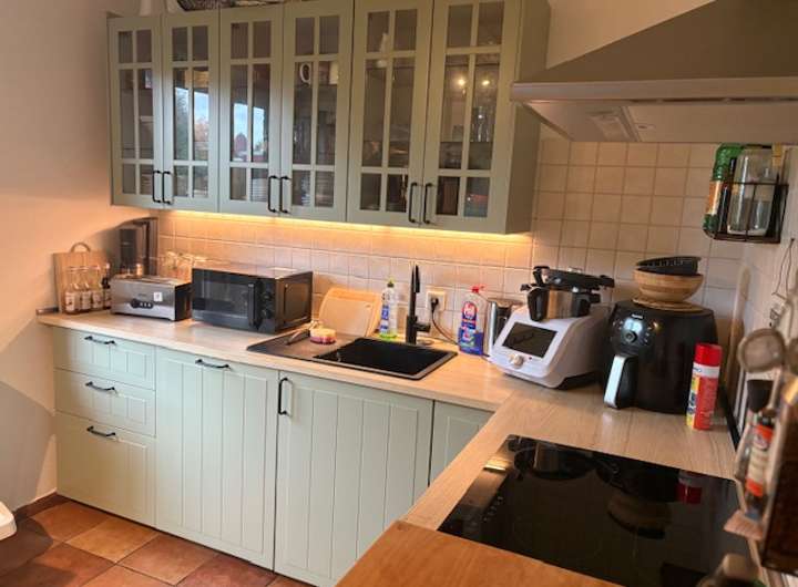Eine Fußbodenerwärmung im Wohnzimmer und oberen Bad ist zusätzlich zu den Heizkörpern vorhanden. Ein geschlossener Kaminofen (2021) befindet sich im Wohnzimmer im EG. Der Fußbodenbelag ist Laminat in allen Zimmern, Fliesen in der Küche und den Bädern. Im oberen Bad gibt es eine Badewanne, im unteren Bad eine Dusche. Die Küche ist mit einer Einbauküche und Elektrogeräten ausgestattet. Die meisten Fenster haben Rolläden, im Wohnzimmer sind diese elektrisch betrieben.