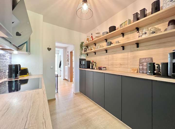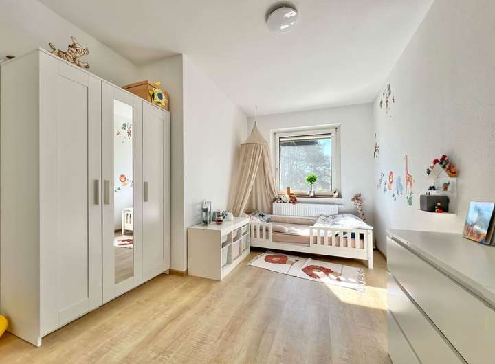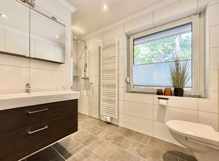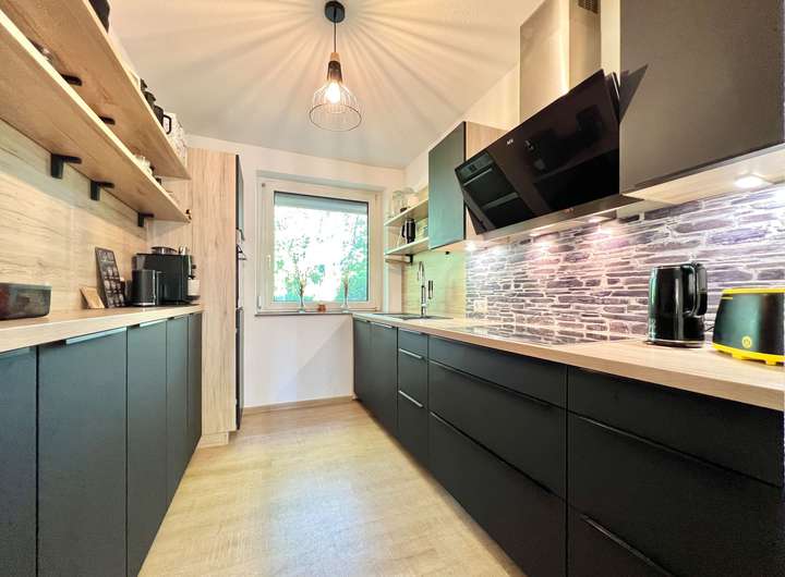 Neben der Einbauküche, dem modernisierten Tageslichtbad und dem erneuerten Gäste-WC wurden auch Designerböden in Holzoptik verlegt sowie weiße Innentüren erneuert.