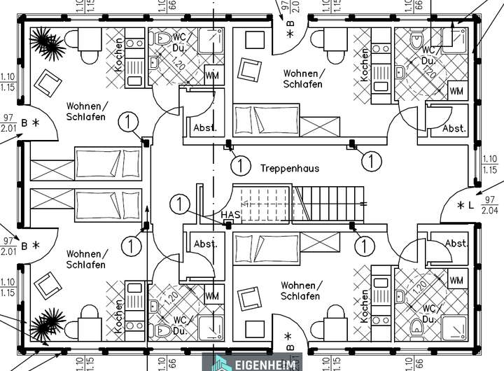jeweils 1 Zimmer Wohnungen a 22-24 qm und 40 qm Gartenanteil pro Wohnung vorgesehen