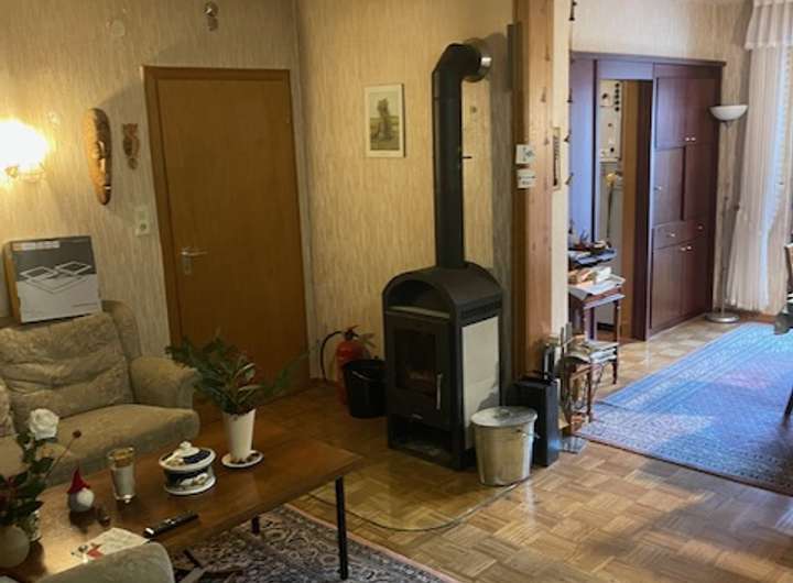 - Wohnzimmer mit Holzparkett und neuem Kaminofen (6 KW)