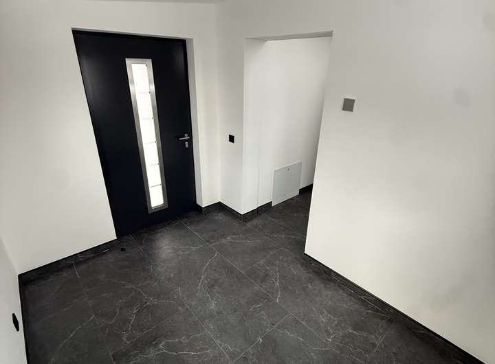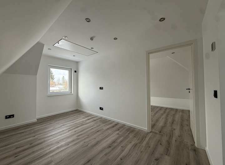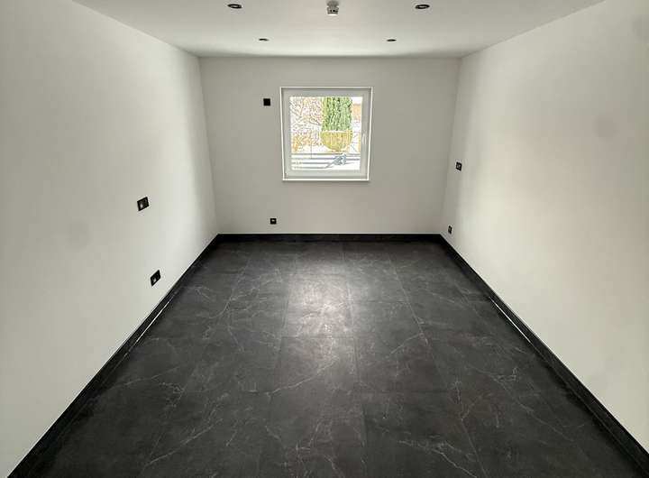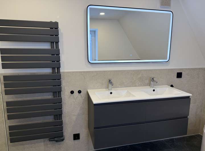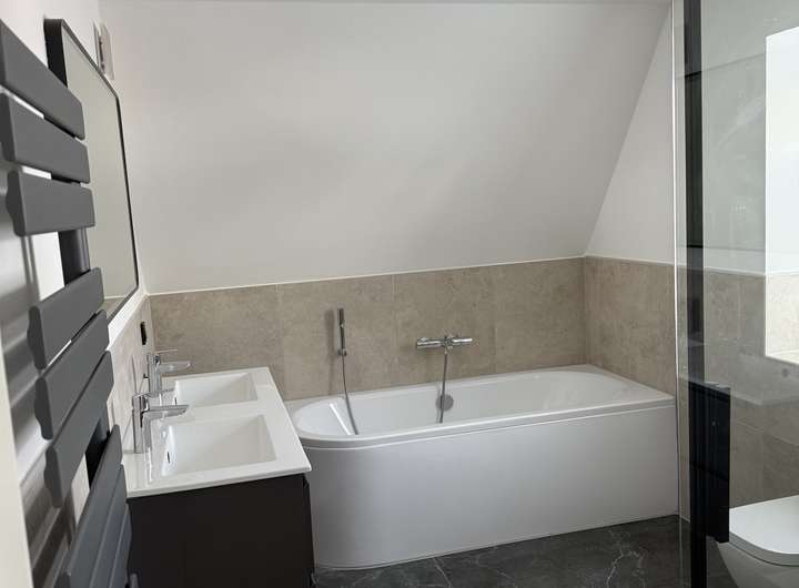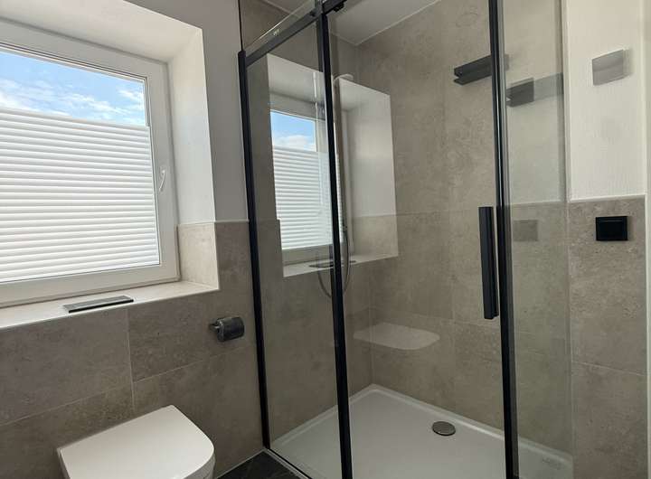 Im Erdgeschoss finden Sie ein praktisches Gäste-WC. Das Hauptbad beeindruckt mit flacher Duschwanne (120×90 cm), beheiztem Spiegel, spülrandlosem WC, XL-Badewanne (180×80 cm) und Doppelwaschtisch mit schwebendem Unterschrank – alles auf hochwertigen XXL-Fliesen (120×60 cm).