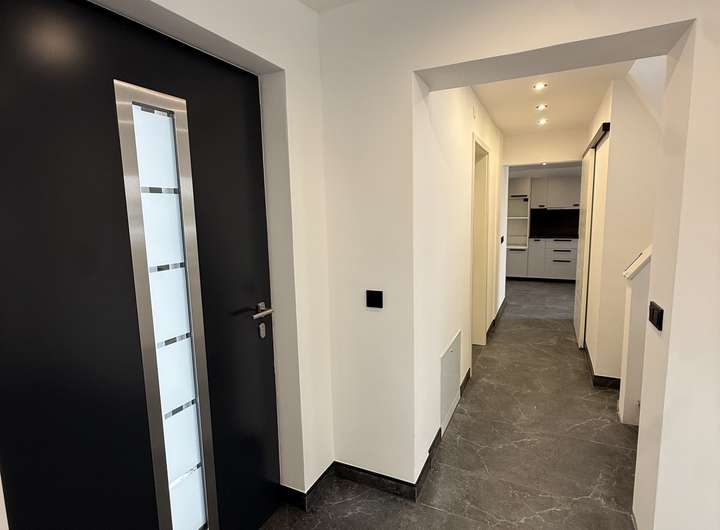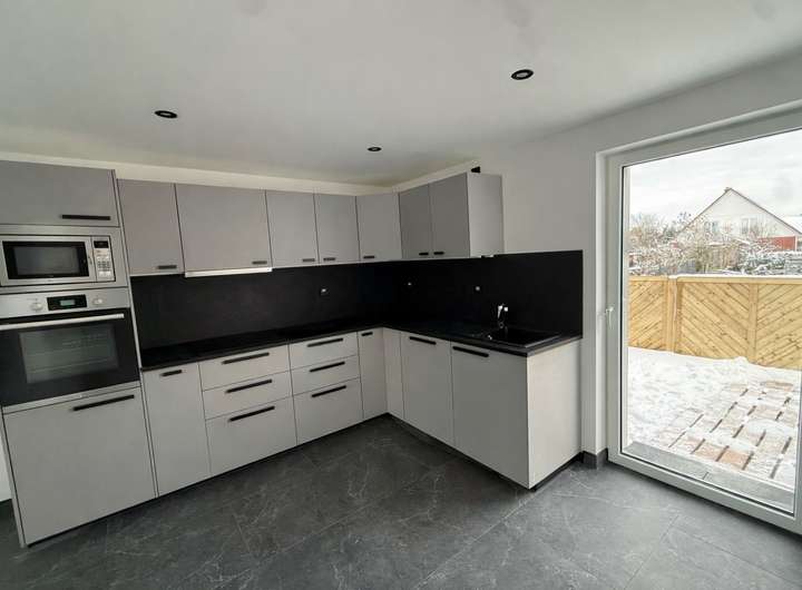 Die moderne Einbauküche ist mit Geschirrspüler, Induktionskochfeld und direkter Abluft nach außen ausgestattet. Ein vorbereiteter Platz für einen Side-by-Side-Kühlschrank und der direkte Zugang zur Terrasse machen die Küche besonders praktisch.