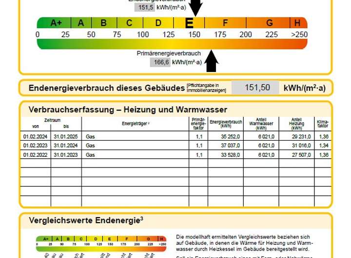 Ein Energieausweis liegt vor, Einstufung ist E (Endenergieverbrauch 151,5 kWh/(m²·a), Primärenergieverbrauch 166,6 kWh/(m²·a)).