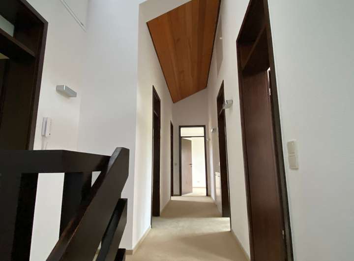 Im Erdgeschoß gibt es eine helle gut ausgestattete Einbauküche mit angrenzendem Abstellraum und Hauswirtschaftsraum, einen großzügigen Wohn- und Essbereich (fast 59m2) mit Kamin, großer Raumhöhe und direktem Zugang zur Terrasse sowie ein Schlafzimmer mit Bad. Im Obergeschoß gibt es 3 Schlafzimmer mit 2 Bädern, eine Empore - die als Arbeitszimmer genutzt werden kann - und eine eingebaute Sauna. Im Keller bietet das Haus Wohnräume wie z.B. einen großen Hobbyraum und einen Bar-Raum, sowie eine Speisekammer, einen Werkelkeller, Heizungskeller und Abstellraum.