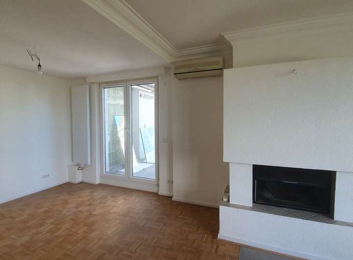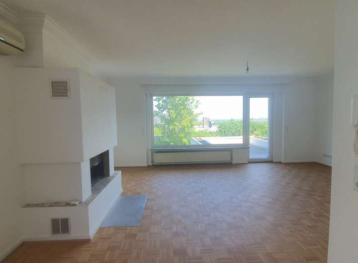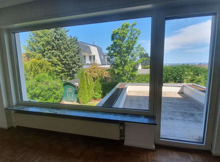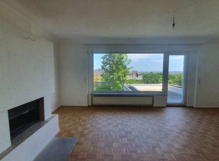 Weiter durch den Flur gelangen Sie in das lichtdurchflutete Wohn- und Esszimmer. Der Blick durch das riesige Fenster reicht bei klarer Sicht bis zum Odenwald. Abends genießt man diesen Blick vor dem Kamin mit einem leckeren Getränk. Während der Sommermonate können Sie wahlweise eine der Terrassen nutzen.