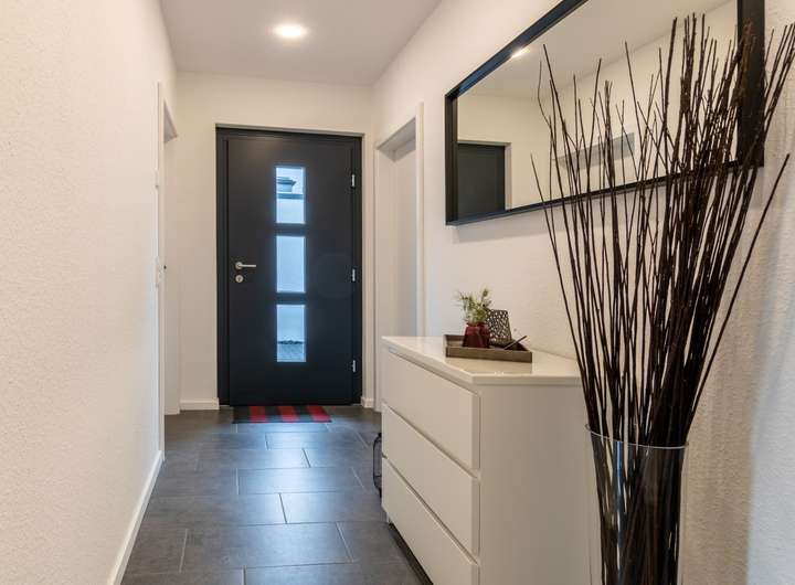Die gehobene Ausstattung des Bungalows lässt keine Wünsche offen. Hochwertige Fliesenbodenbeläge sorgen für eine moderne und pflegeleichte Optik, während Sie bei der Auswahl weiterer Bodenbeläge flexibel sind und Ihren persönlichen Stil einbringen können. Die Beheizung erfolgt umweltfreundlich über eine effiziente Wärmepumpe, die den strengen KFW40-Standard erfüllt und somit für nachhaltiges Wohnen sorgt. Freuen Sie sich auf eine perfekt abgestimmte Sanitär-Grundausstattung in der Ausbaustufe FastFertigPlus.