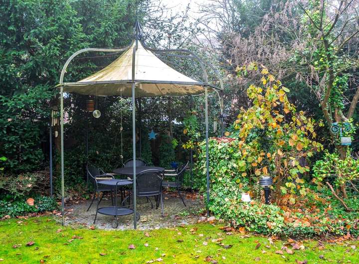 Der Garten und die Terrassenbereiche liegen in südlicher Ausrichtung und sind, durch die hohe Einfriedung, nicht einsehbar.