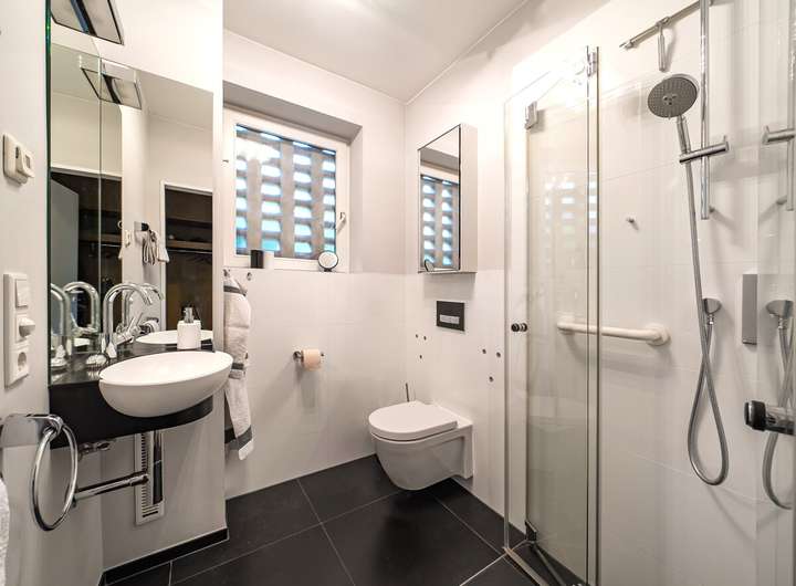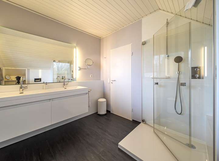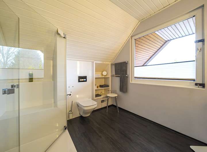 Sanitär: Tageslichtbad mit ebenerdiger Dusche im Erdgeschoss (saniert in 2015) sowie Duschbad im Dachgeschoss (saniert in 2013)