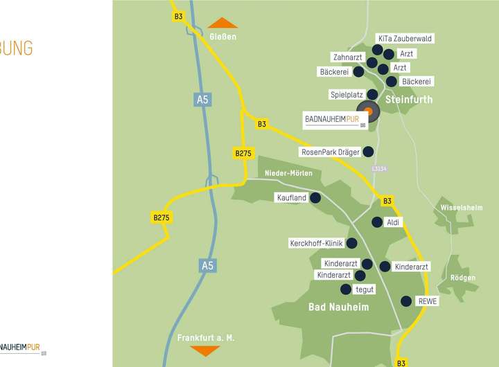 Die schnelle Anbindung an verschiedene Großstädte über den nahegelegenen Bahnhof und die A5 macht Steinfurth besonders attraktiv für alle, die das urbane Leben in Reichweite behalten, aber einen Lebensmittelpunkt