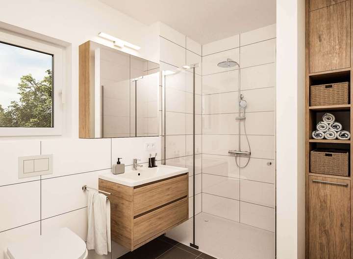 • Böden, Wandfliesen und Sanitärobjekte individualisierbar