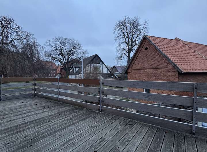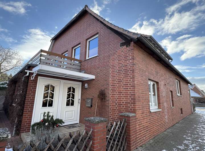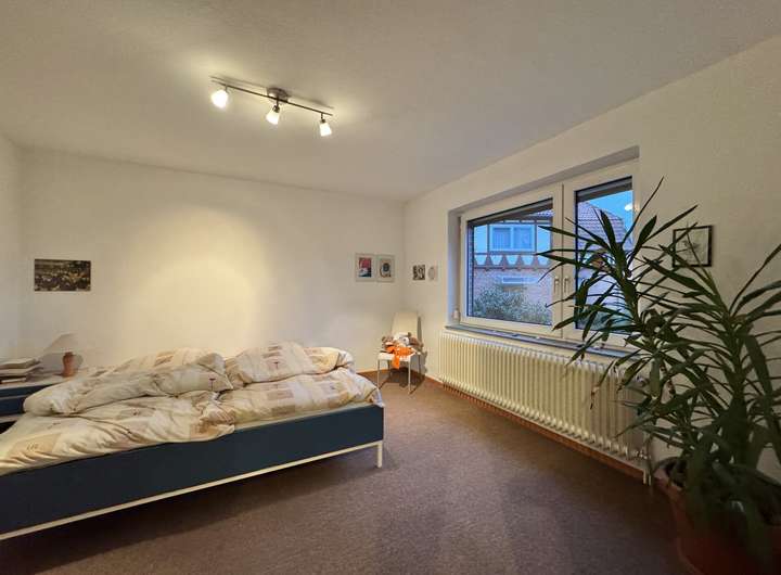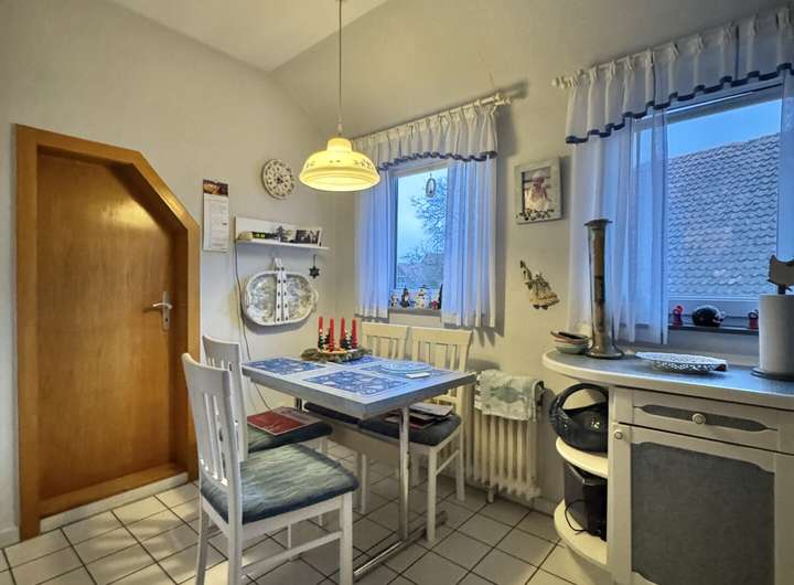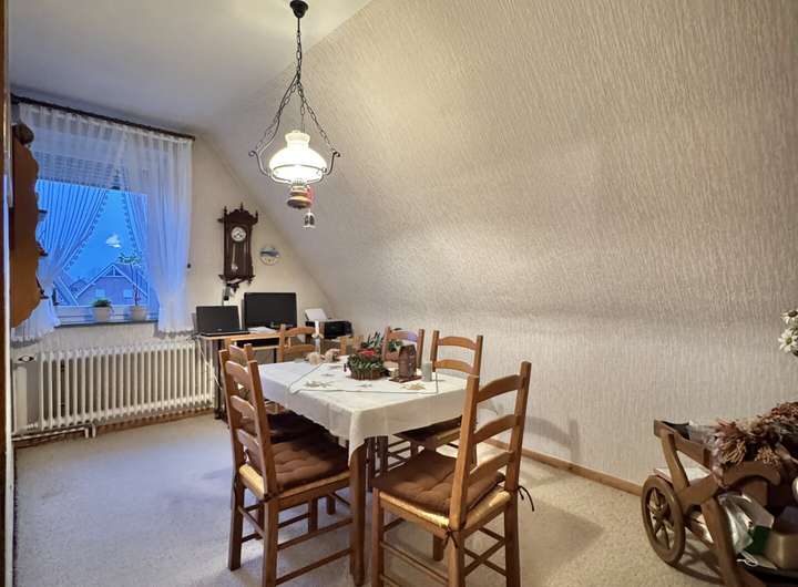 Die Wohnung im Obergeschoss verfügt über einen eigenen Eingang. 3,5 Zimmer verteilen sich auf ca. 88 m² Wohnfläche. Alle Räume gehen von der Diele ab. Die Küche bietet Platz für eine kleine Essecke, dahinter liegt ein kleiner Raum (halbes Zimmer). Der Wohnbereich ist angenehm groß und durch die Ausrichtung zur Giebelseite schön sonnig. Ein Esszimmer & ein Schlafzimmer ergänzen das Raumangebot. Das Badezimmer ist mit einer Dusche & Fenster ausgestattet. Oberhalb der Wohnung liegt ein Dachboden.