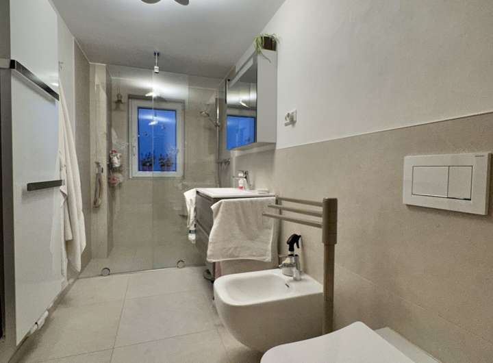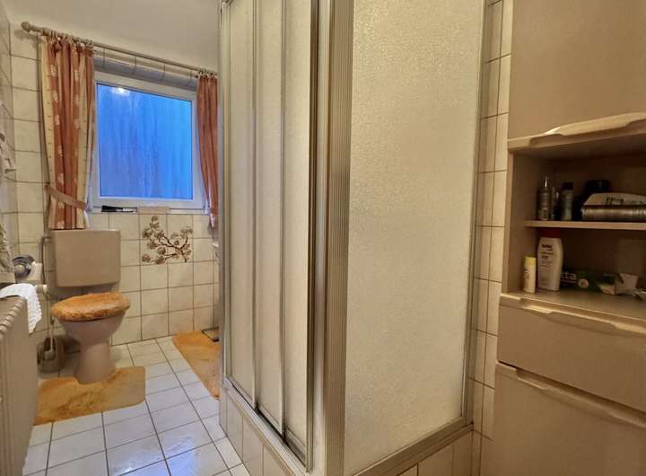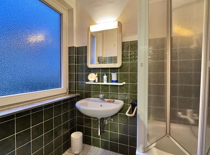Ein modernisiertes Tageslichtbad mit elektrischer Fußbodenheizung & bodengleicher Dusche. Der Zugang zum Treppenhaus finden Sie hier ebenfalls.
