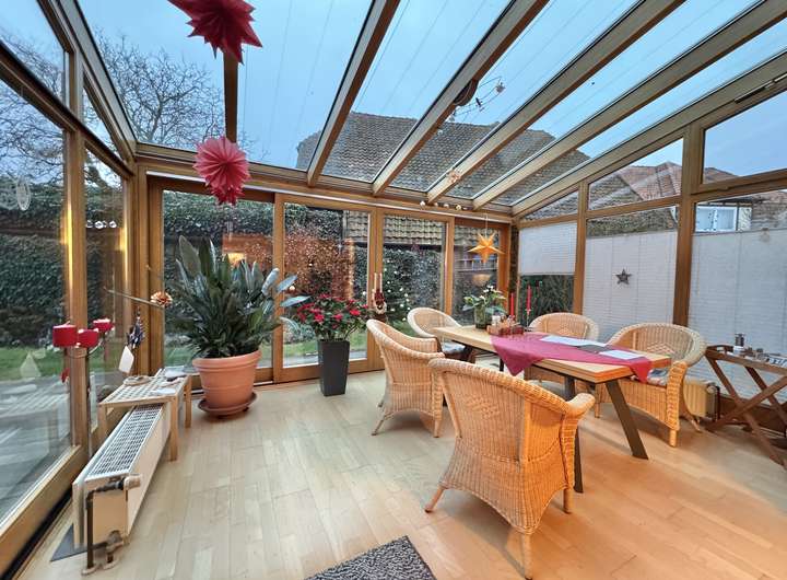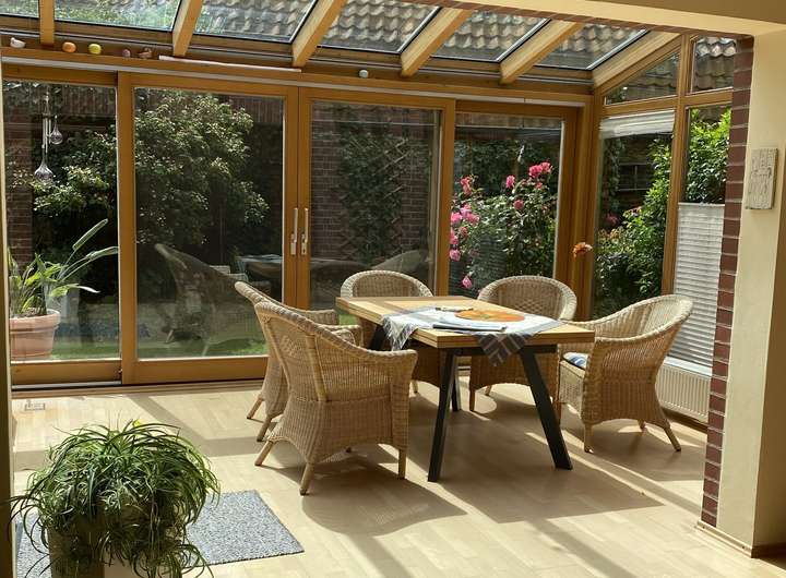 Die große Wohnung Nr. 1 betreten Sie über einen kleinen Windfang mit Platz für eine Garderobe. Von dort aus gelangen Sie in den Flur, von dem aus diverse Räume und die Treppe in das Obergeschoss abgehen. Die Küche bietet Platz für eine kleine Essecke. Das Gäste-WC verfügt über ein Fenster. Angrenzend befindet sich der große Wohn- und Essbereich mit dem Highlight im Haus: der beheizbare & verglaste Wintergarten.