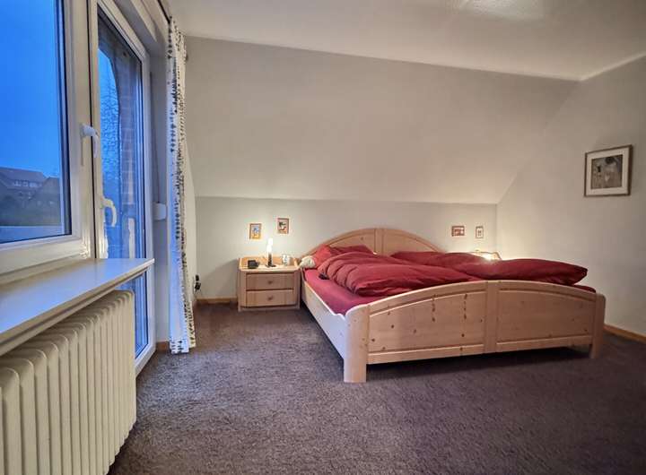 Über eine Treppe geht es in das Obergeschoss. Hier befinden sich zwei Schlafzimmer und ein großer Balkon.