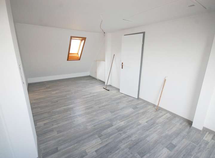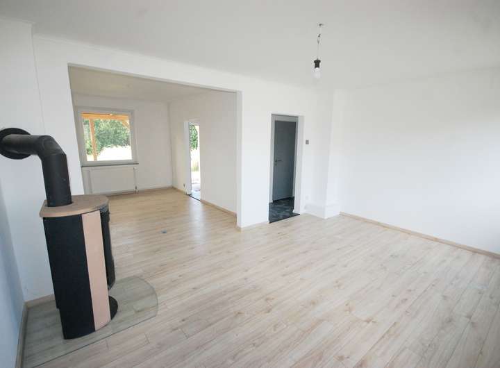 Beim Betreten des Hauses gelangen Sie direkt in den Flur, von dem aus alle Räume des Erdgeschosses zugänglich sind. Die Küche ist bereits ausgestattet mit einer Einbauküche. Das Badezimmer verfügt über eine Badewanne, ein WC und Fenster. Der großzügige Wohn- und Essbereich ist über zwei Eingänge vom Flur aus erreichbar. Vom Flur aus haben Sie direkten Zugang zum Garten, den Sie durch eine weitere Haustür betreten können.