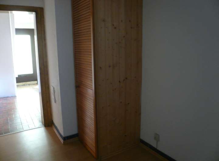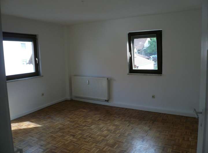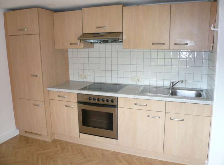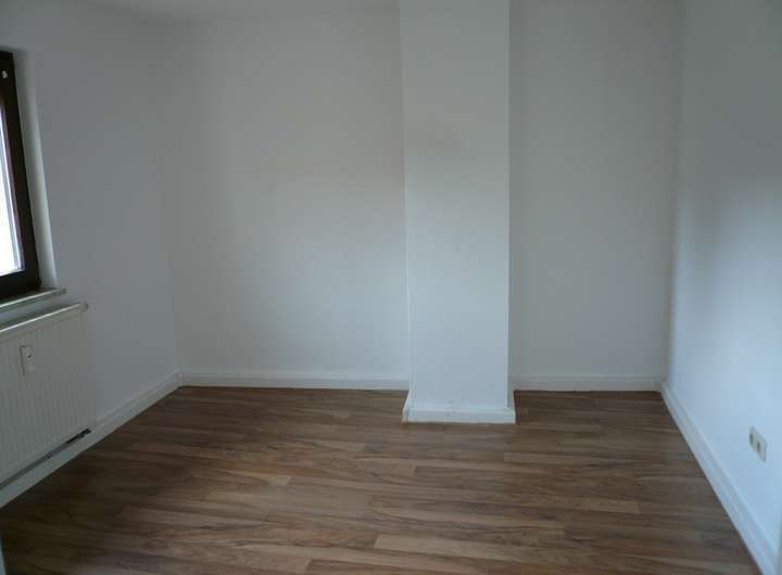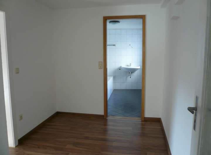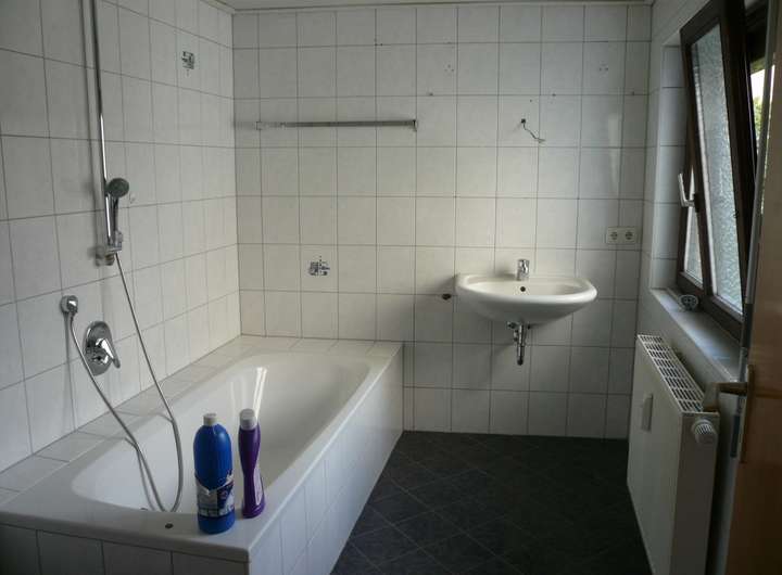 Einfamilienhaus mit 4 Zimmer, Küche und Bad. Im Badezimmer ist eine Wanne mit Duschmöglichkeit und einem Fenster. In der Küche befindet sich eine Einbauküche. Die Fußböden sind mit Parkett und Laminat ausgelegt. Die Wände sind mit Raufaser tapeziert und weiß gestrichen.