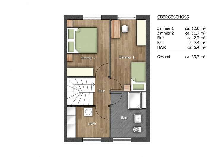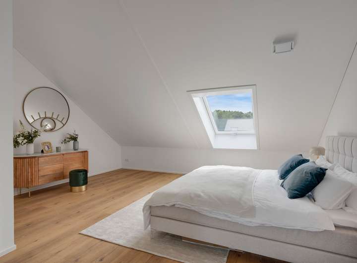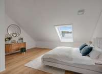 Das erste Obergeschoss mit ca. 40 m² umfasst zwei gut geschnittene Zimmer, ein modernes Bad sowie einen praktischen Hauswirtschaftsraum. Im Dachgeschoss stehen auf ca. 30 m² ein weiteres Zimmer, ein zusätzliches Bad sowie ein Abstellraum zur Verfügung, wodurch auch hier ein hohes Maß an Komfort und Flexibilität gewährleistet wird.