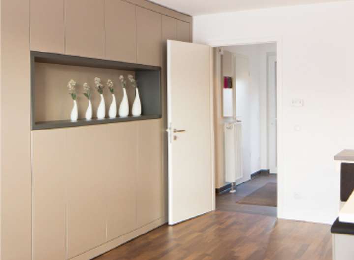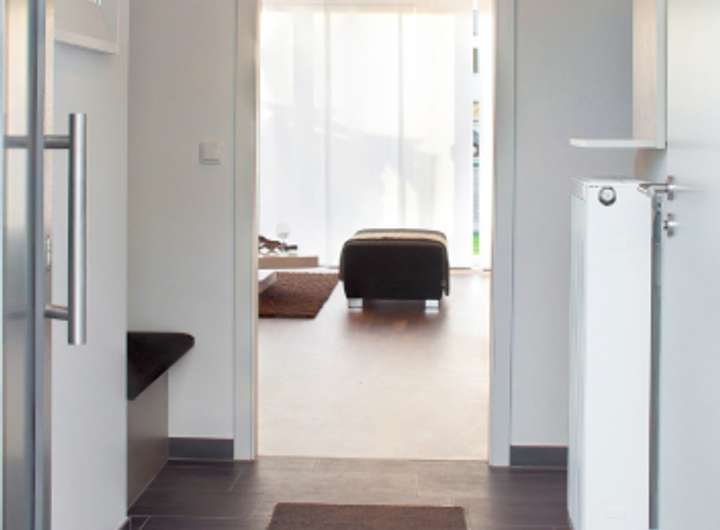 Die Innentüren sind neutral in weiß gehalten und mit Edelstahl-Garnituren versehen.
