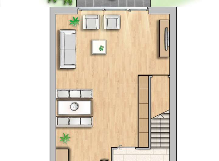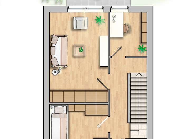Sie betreten das Erdgeschoss und merken direkt, wie lichtdurchflutet Ihr neues Zuhause ist. Von der Diele gelangen Sie in den Wohnbereich mit offener Küche.