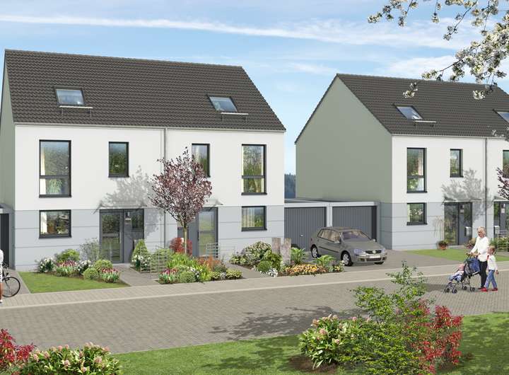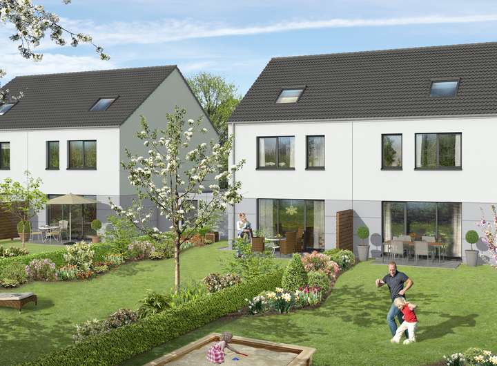 Die Bilder zeigen das Musterhaus des Bauträgers und sind nur beispielhaft. Das Haus wird unmöbliert vermietet. Eine Einbauküche ist vorhanden. Fußbodenbeläge und Malerarbeiten entsprechen teilweise nicht dem hier zu vermietenden Haus.
