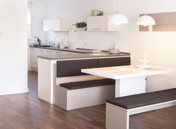 Die Küchenzeile ist in Hochglanz weiß gehalten mit weißen Paneelen und die Arbeitsplatte ist in anthrazit.