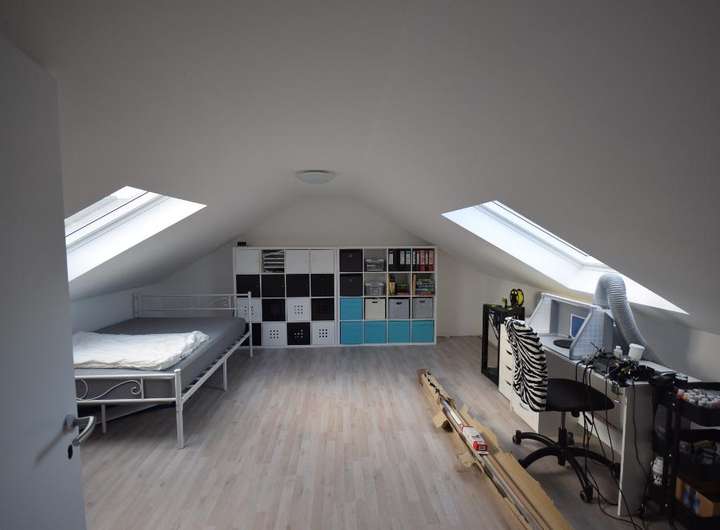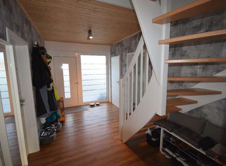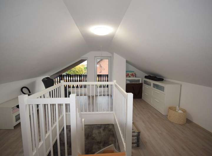 Im Erdgeschoss befinden sich das Wohnzimmer, 2 Kinderzimmer, 1 Schlafzimmer, Küche, 2 Abstellräume, Badezimmer und das Gäste-WC. Im Dachgeschoss sind 2 weitere Zimmer neu Ausgebaut und eine Loggia. Wer mehr Platz braucht, der kann sich das Dachgeschoss um ca 20qm weiter ausbauen. Alle Fenster- bis auf Küche und Wohnzimmer sind neu und 3 fach verglast. Alle Fenster verfügen über Rollläden. Beheizt wird dieses Objekt über eine 3000 Liter Öl Zentralheizung mit Warmwasseraufbereitung. Eine große Garage mit dahinterliegendem Anbau runden das Gesamtbild dieser Immobilie ab. Das Grundstück umfasst 1.096 m² und bietet viel Platz für Gartengestaltungen.