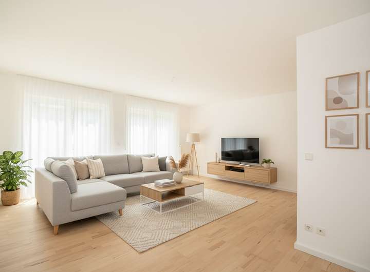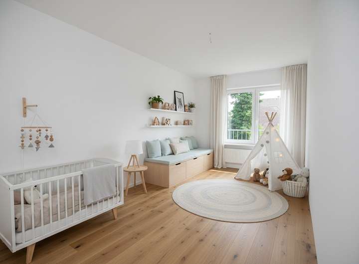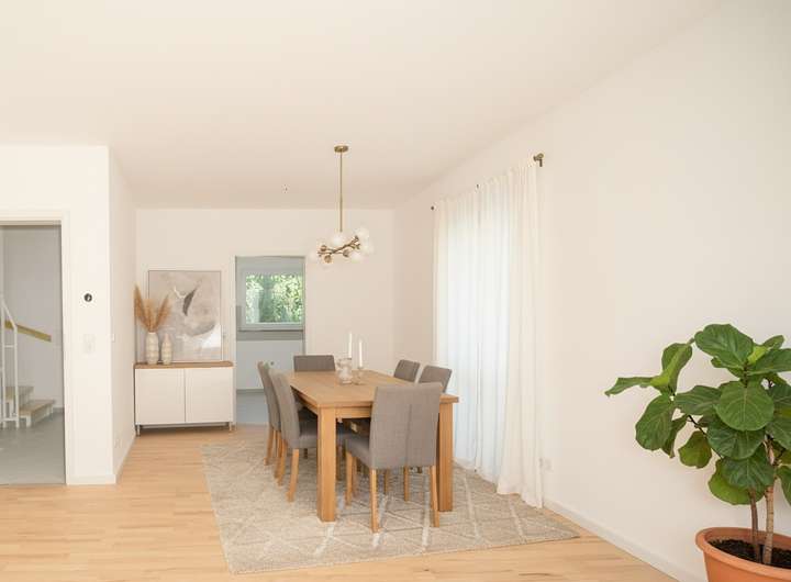Im Erdgeschoss bildet der offene Wohn- und Essbereich das Herzstück des Hauses. Große Fenster lassen viel Tageslicht herein und schaffen eine helle, freundliche Atmosphäre. Der hochwertige Parkettboden sorgt für ein warmes, wohnliches Ambiente – ideal für gemütliche Stunden mit der Familie.