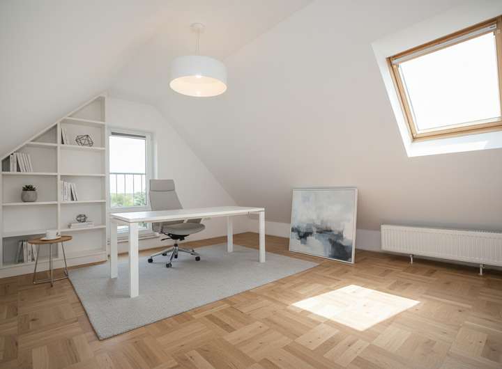 Ein weiteres Highlight ist das ausgebaute Dachgeschoss mit einem großen Studio, das sich flexibel nutzen lässt – sei es als Spielzimmer, Rückzugsort für Teenager oder kreativer Arbeitsplatz.