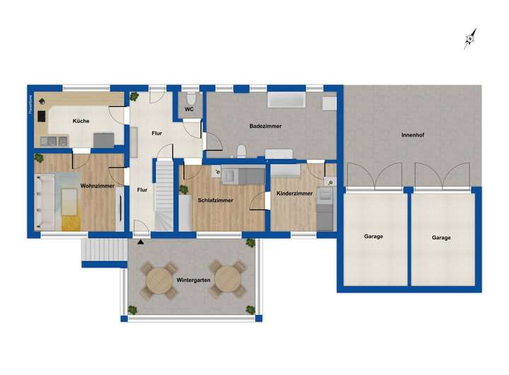 Im Erdgeschoss befinden sich ein großzügiges Wohnzimmer, ein Schlafzimmer mit Ankleide, eine Küche, ein Tageslichtbad anschließend an das Waschhaus sowie ein Gäste-WC. Ein beheizter Wintergarten im Erdgeschoss rundet die Etage ab. Der Wintergarten ist über den Flur erreichbar und verfügt über einen direkten Zugang zum Garten.