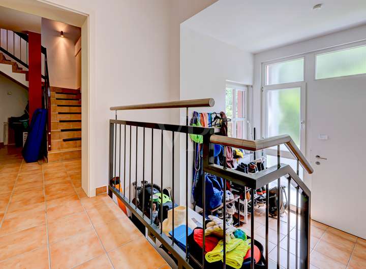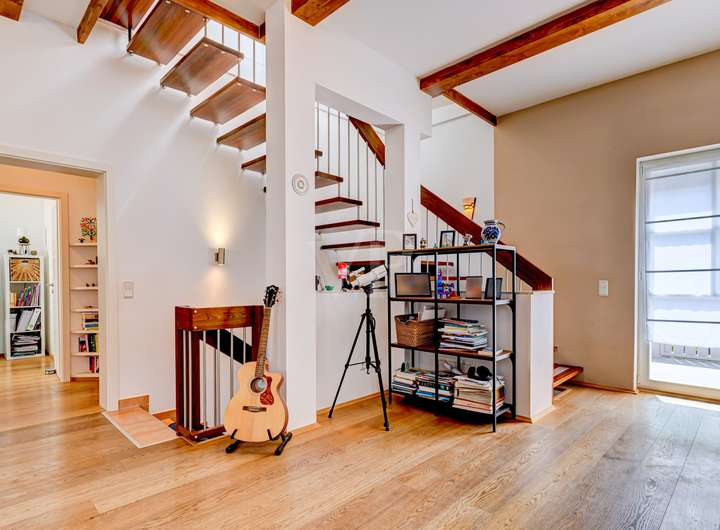 Bereits beim Betreten des Hauses spürt man die großzügige Architektur: Die Räume wirken offen, hell und einladend. Das Erdgeschoss empfängt seine Bewohner mit einem direkten Zugang in den gepflegten Garten – eine grüne Oase zum Entspannen und Verweilen. Besonders hervorzuheben ist der private Saunabereich, der exklusiven Komfort und Wellness direkt im eigenen Zuhause ermöglicht. Die Raumhöhe von ca. 3,20 Metern sorgt dabei für ein außergewöhnliches Raumgefühl und verleiht den Zimmern ein herrlich luftiges Ambiente.