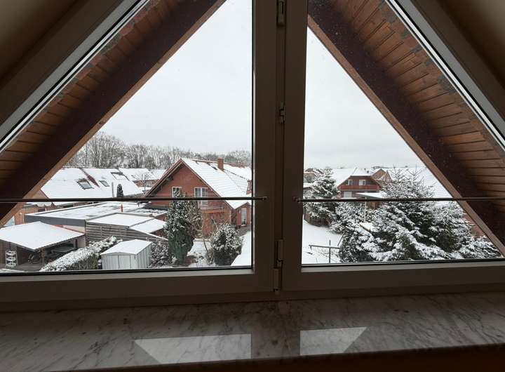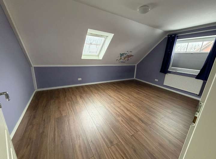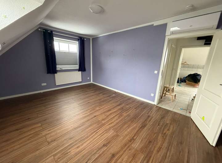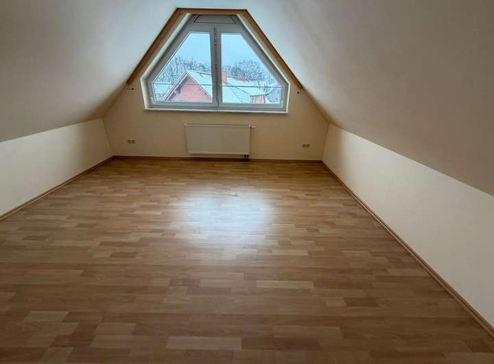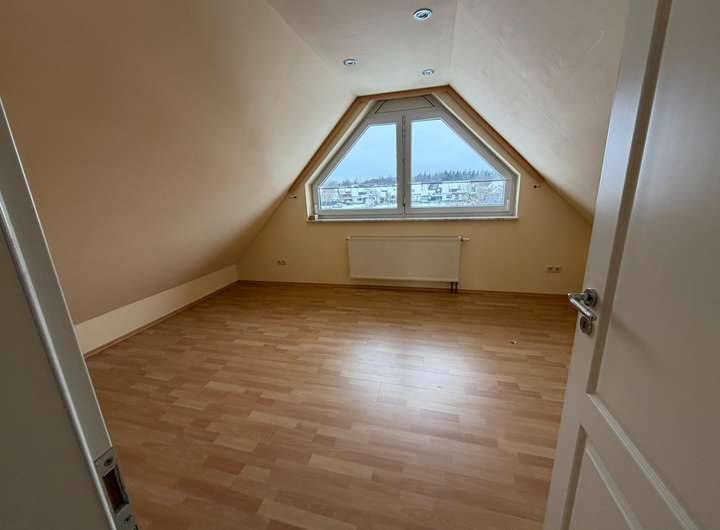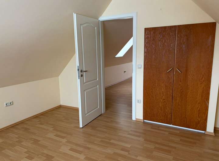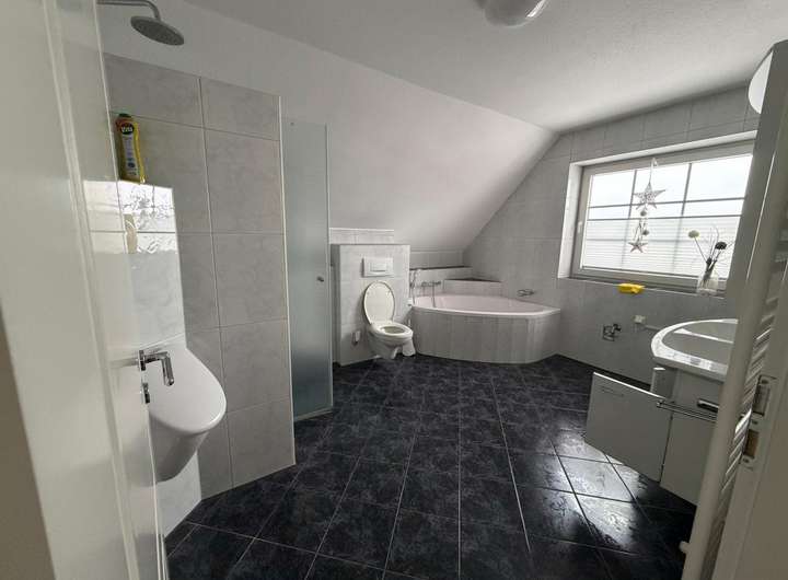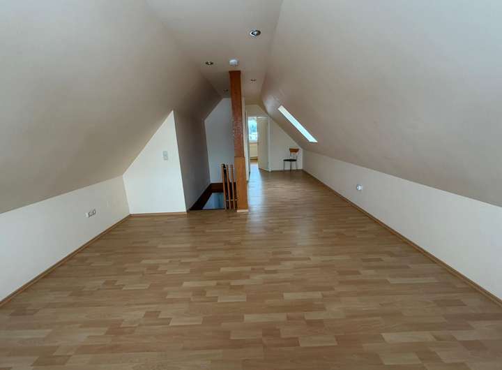 Im Obergeschoss befindet sich ein großzügiges Badezimmer mit Eckbadewanne, Dusche, Bidet, Pissoir und Doppelwaschbecken. Die weiteren vier Zimmer können nach Belieben als Schlafzimmer, Aufenthaltsraum, Spielzimmer, Arbeitsraum, Büro, zweites Wohnzimmer oder zweite Küche (alle Anschlüsse bereits vorhanden) genutzt werden. Eine Treppe führt in die Dachspitze, wo sich ein Aufenthaltsraum, ein Schlafzimmer und ein Abstellraum befinden.