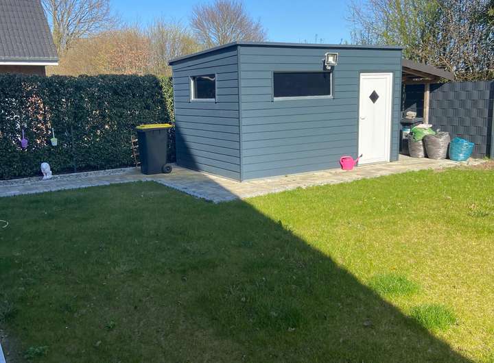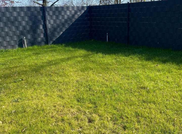 Grundstueck ca. 557 Quadratmeter mit grosser Rasenflaeche, Terrasse und Schuppen.