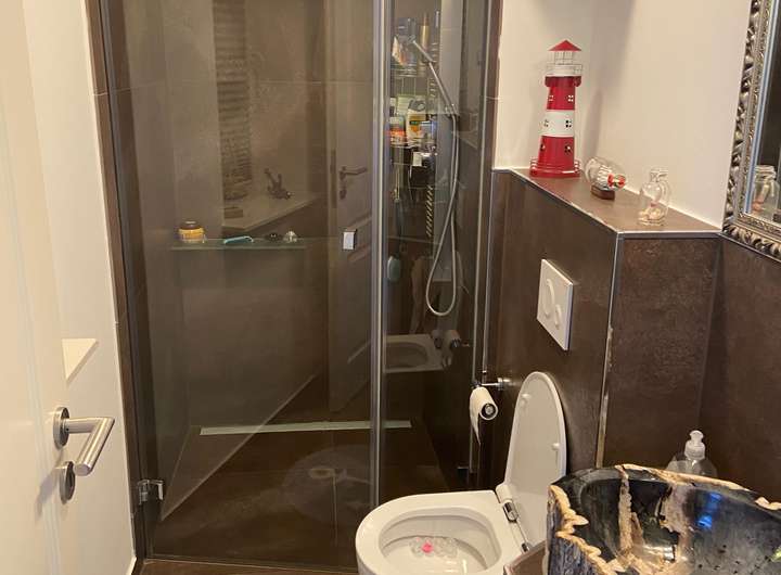 Erdgeschoss mit Wohnzimmer, Kueche und Gaestebad mit Dusche.