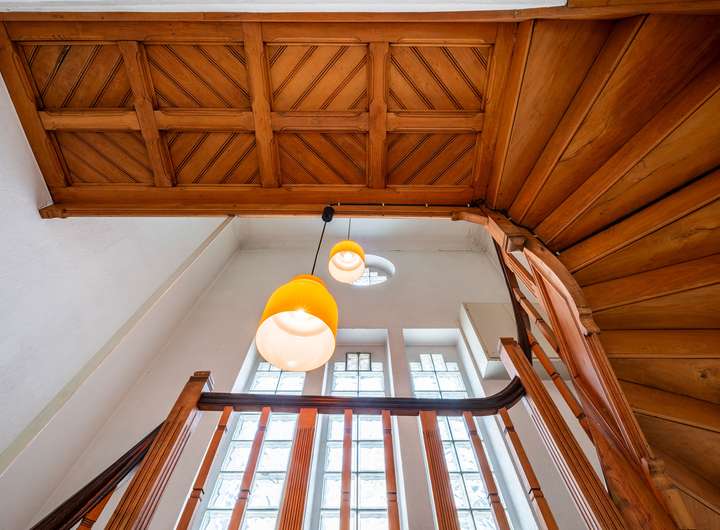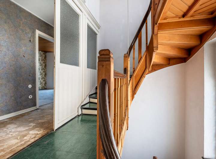 Wer durch die Haustür tritt, wird empfangen von einem Treppenhaus, das das Herz jedes Altbaufans höherschlagen lässt: geschnitzte Holzverzierungen, warmes Naturholz, feine Details – ein handwerkliches Erbe, das man nicht schaffen kann, sondern bewahrt.