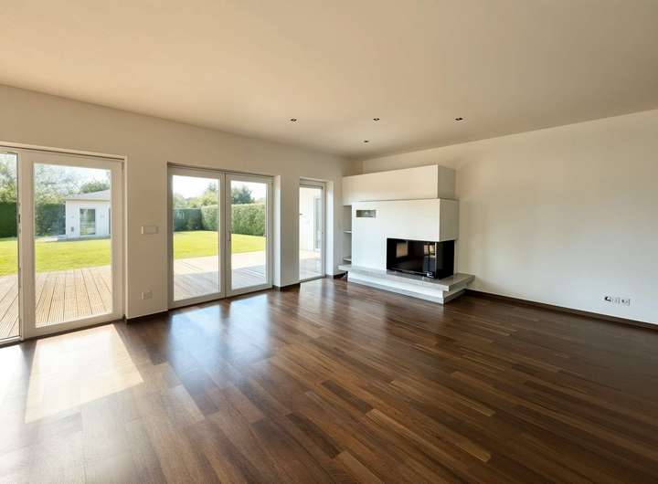 Der großzügige Wohn- und Essbereich mit offener Küche bildet das Herzstück des Hauses. Eine großflächige Fensterfront in Ost- und Südausrichtung sorgt für lichtdurchflutete Räume und schafft in Verbindung mit dem luxuriösen Kamin eine warme, behagliche Atmosphäre. Die hochwertige Einbauküche inklusive Marken-Geräten ist im Kaufpreis enthalten. Durch die vollständig zu öffnenden Türen verschmilzt der Wohnraum mit Terrasse und Garten. Ideal für Feste und gesellige Stunden im Freien.