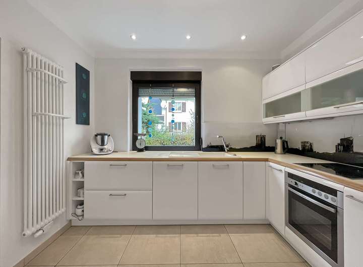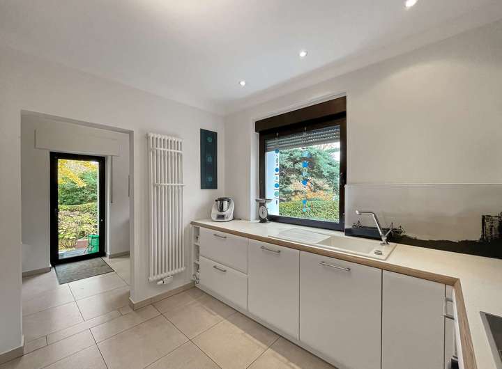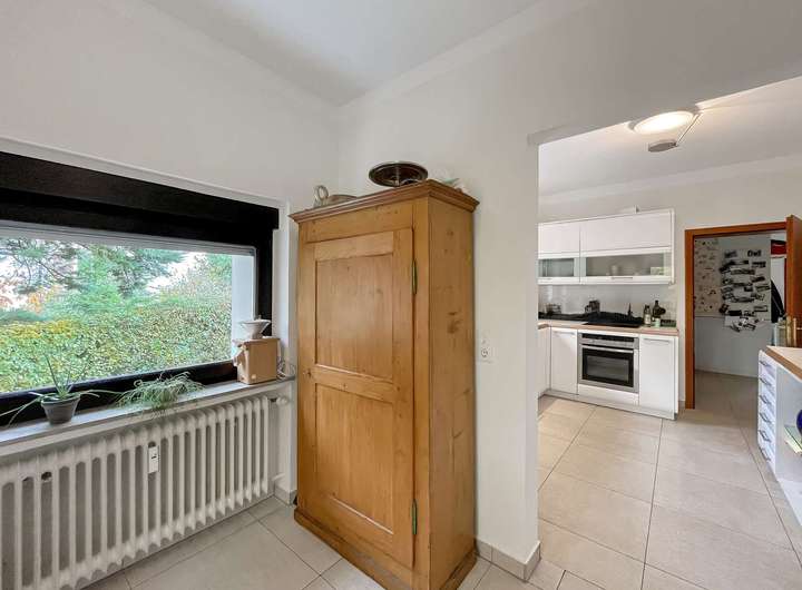 Die Küche mit extragroßer Durchreiche ist praktisch vom Wohnbereich getrennt – eine Lösung, die sowohl Vorteile als auch kommunikative Offenheit schafft. Von hier gelangen Sie in den äußerst gepflegten Westgarten, der mit einem prächtigen Magnolienbaum ein wahres Paradies für Gartenliebhaber darstellt.