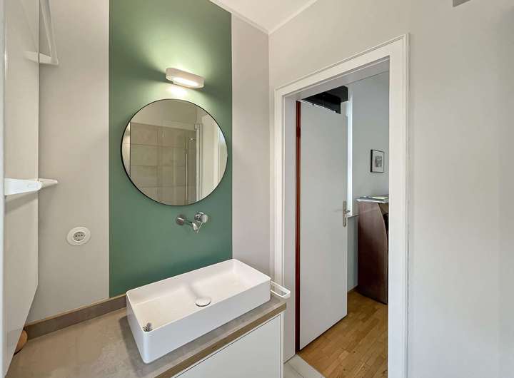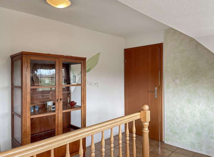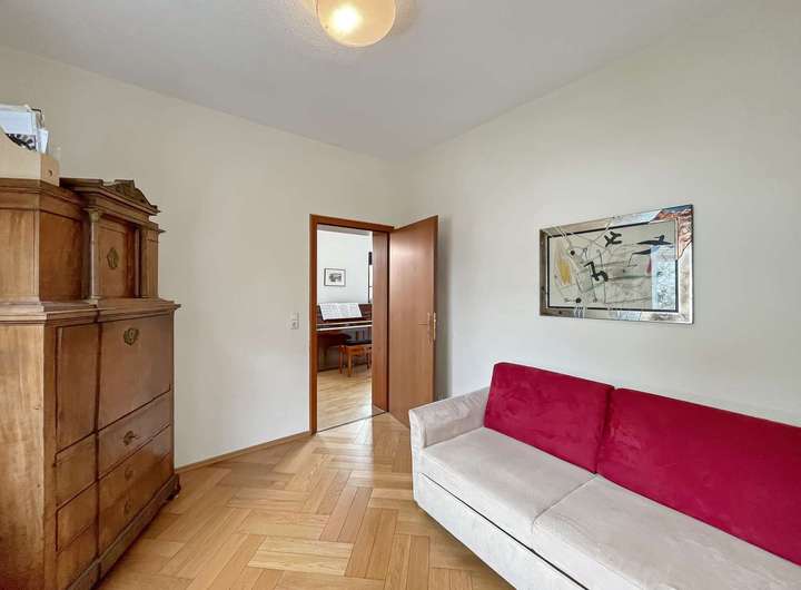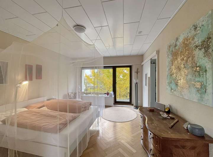 Im Obergeschoss erwartet Sie ein großzügiges Elternschlafzimmer mit Ankleide und Zugang zu einem Balkon mit Blick ins Grüne. Das angrenzende Tageslichtbad wurde 2015 modernisiert und mit Schreineranfertigungen, bodengleicher Dusche sowie hochwertigen Sanitärobjekten von Geberit und Grohe ausgestattet. Ein weiteres Zimmer bietet Platz für Kinder, Homeoffice oder Gäste.