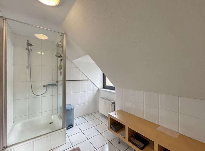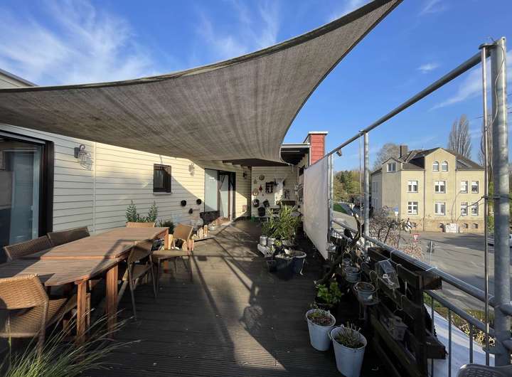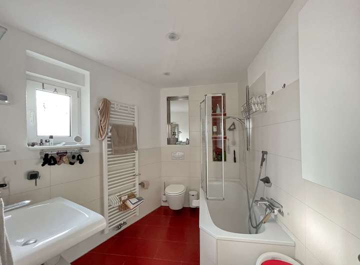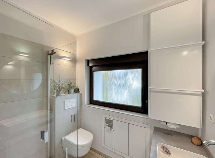 Über einen separaten Hauszugang erreichen Sie die ca. 108 m² große, moderne Einliegerwohnung mit hervorragendem Grundriss für 1–3 Personen. Besonders hervorzuheben ist die großzügige Dachterrasse mit fließendem Wohn-Essbereich von etwa 50 m².