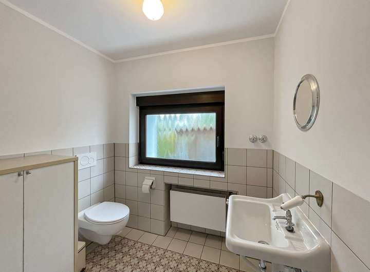 Mit rund 192 m² Wohnfläche erstreckt sich das Haupthaus über drei Ebenen und verbindet klassische Baukunst mit durchdachter Funktionalität. Beim Betreten des Erdgeschosses empfängt Sie ein großzügiges Entrée, das ausreichend Platz für eine Garderobe bietet und direkt zu einem geschmackvollen Gäste-WC mit Retro-Stilelementen führt. Ein weiteres Zimmer auf dieser Ebene lässt sich flexibel als Büro oder Schlafzimmer nutzen.