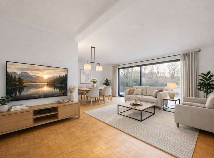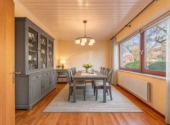Im Erdgeschoss empfängt Sie ein langer, repräsentativer Flur mit Gäste-WC, von dem aus sowohl das separate Esszimmer als auch das großzügige Wohnzimmer erreichbar sind. Bodentiefe Schiebe-Fensterelemente sorgen für viel Tageslicht und ermöglichen den direkten Zugang zur Terrasse. Die separate Küche ist brandneu, hochwertig ausgestattet und wird erstmals genutzt.