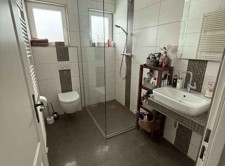 Die Wohnfläche verteilt sich auf Obergeschoss und ausgebautes Dachgeschoss und umfasst 5 Zimmer, ein Badezimmer sowie ein Gäste-WC mit Dusche. Zusätzlich stehen ein beheizbarer Wintergarten sowie ein vollständig gefliester Keller zur Verfügung, die nicht in die Wohnflächenberechnung einbezogen sind.