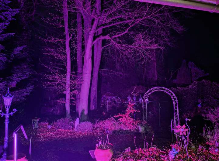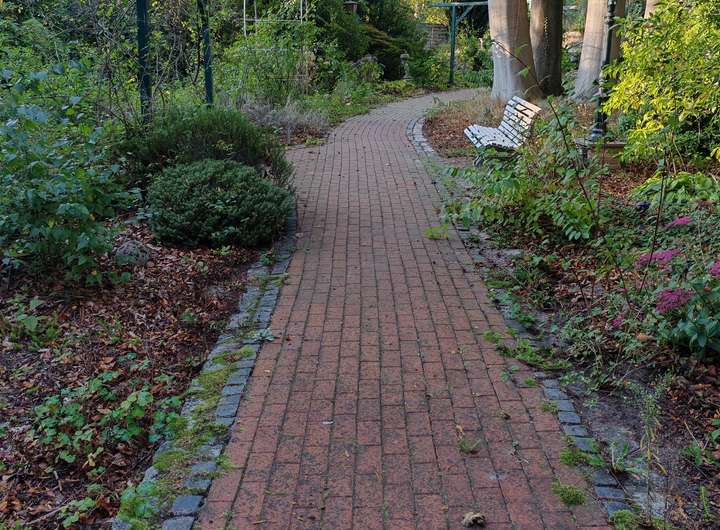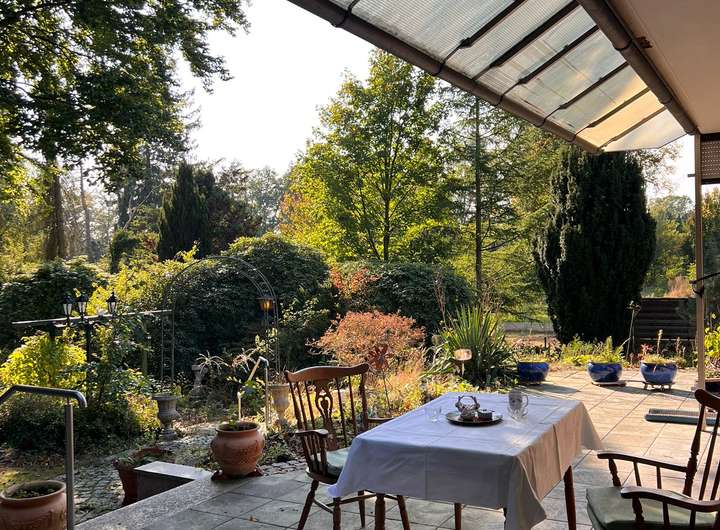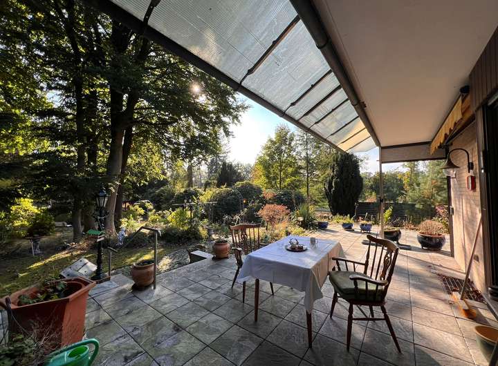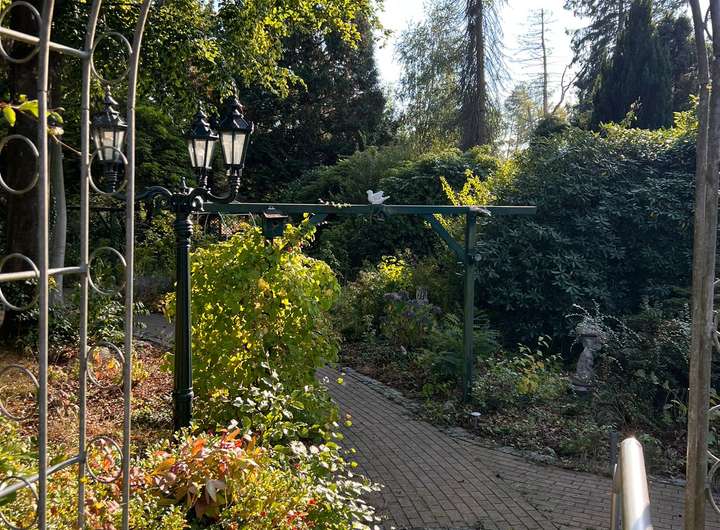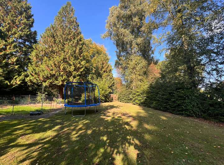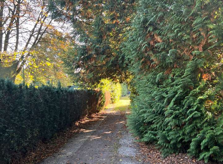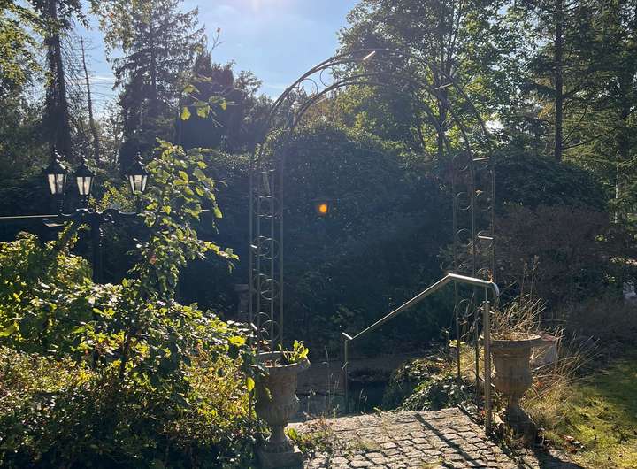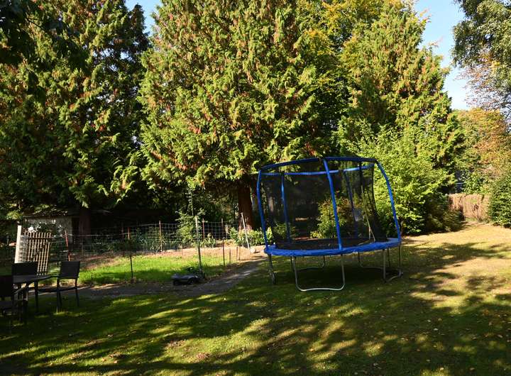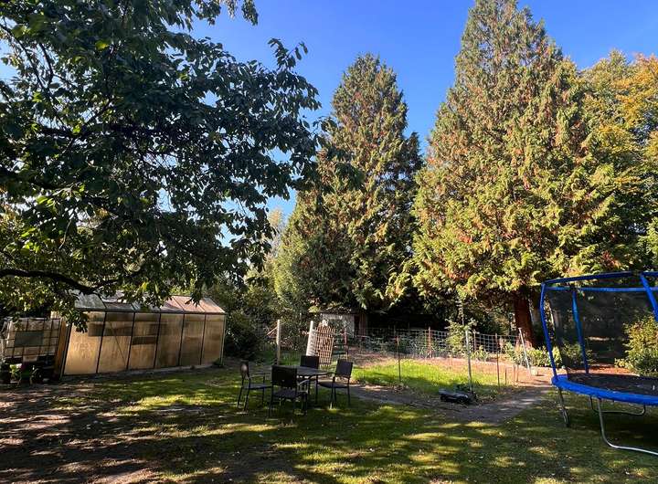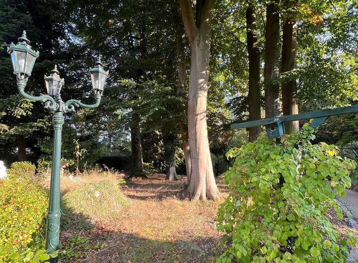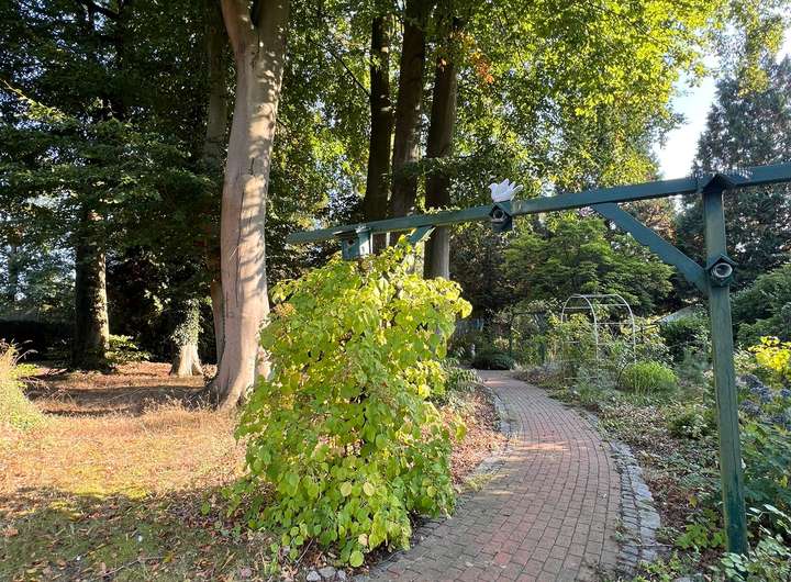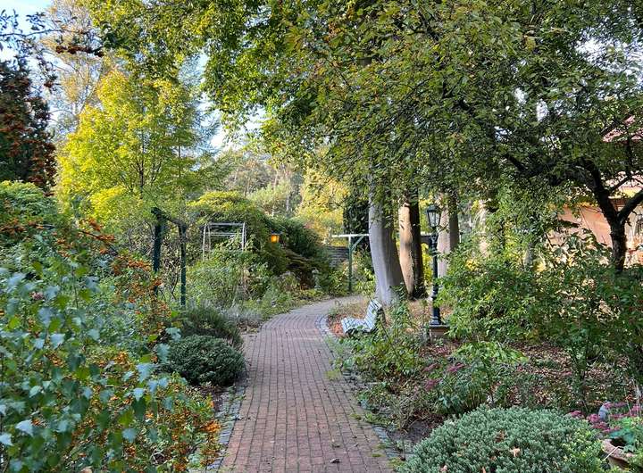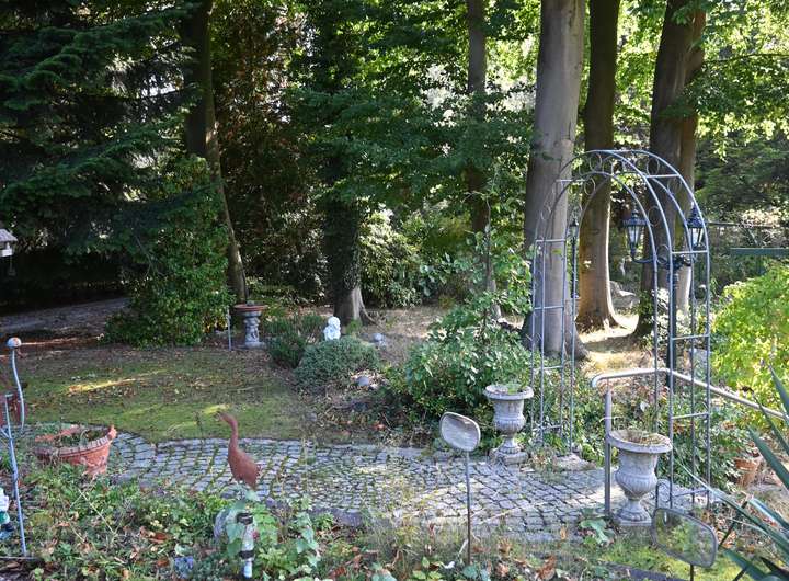 Im hinteren Teil der Anlage befindet sich der Große Garten mit Rasenfläche und großem Süßkirschbaum, welcher über den kleinen Park erreichbar ist, aber auch eine seitliche Zufahrt hat für Pkw mit Anhänger. Der kleine Park hat charmant angelegte Wege, begleitet von ein paar gepflegten Buchen sowie kanadischen Redzedern. Es befindet sich ein weiterer Unterstand für Anhänger, Gerätschaften etc. dort, sowie ein Gewächshaus und ein Brunnen.