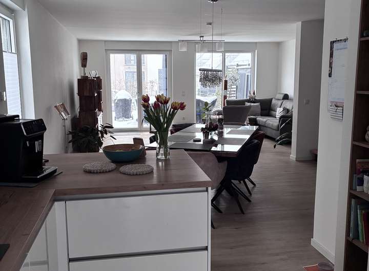Im Erdgeschoss befindet sich ein offener Wohn- und Essbereich mit direktem Zugang zur Terrasse und dem Garten. Die offene Küche lässt keine Wünsche offen. Ein Gäste-WC rundet das Angebot im Erdgeschoss ab.